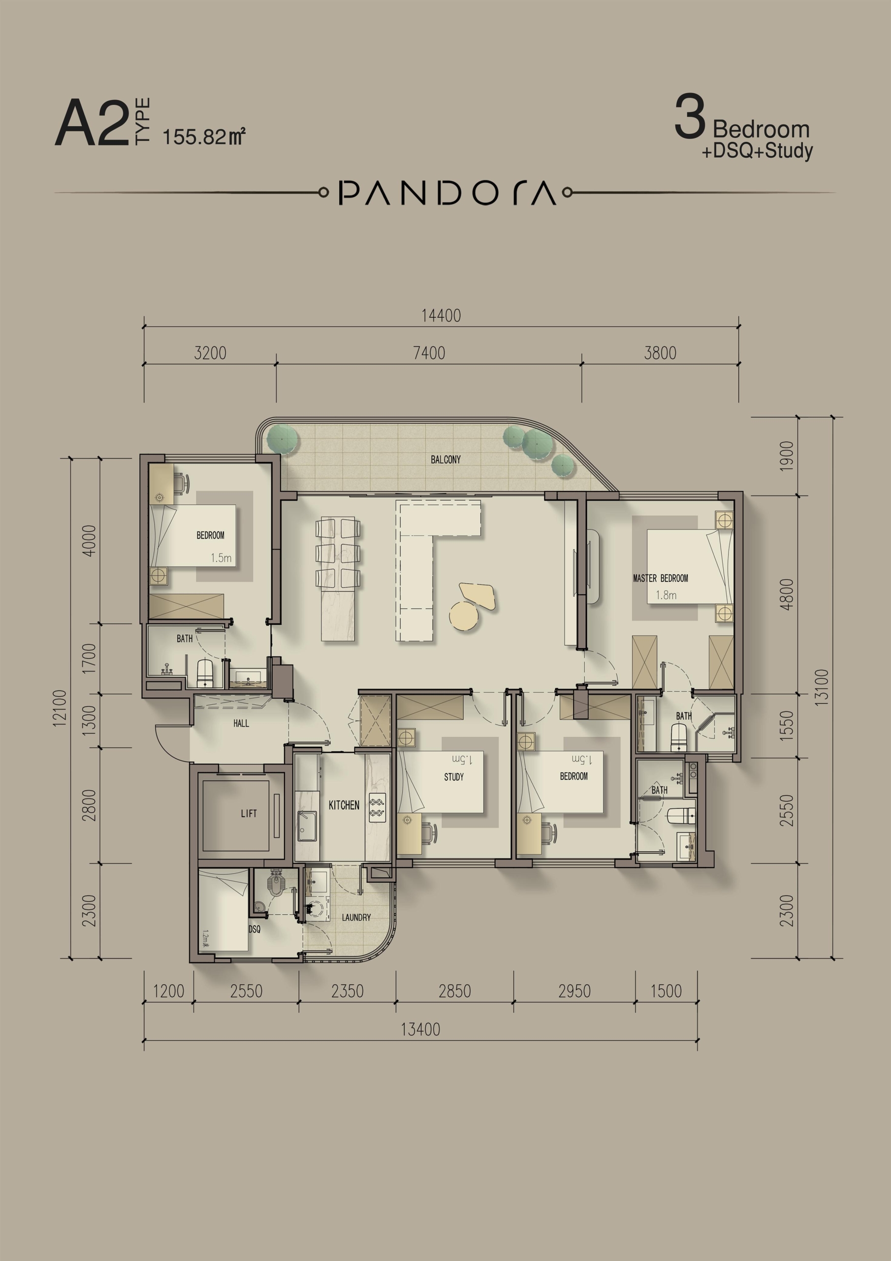 •⁠ ⁠3 bedroom + Study room + DSQ 155.82 sqm From 24.61M to 27.89M